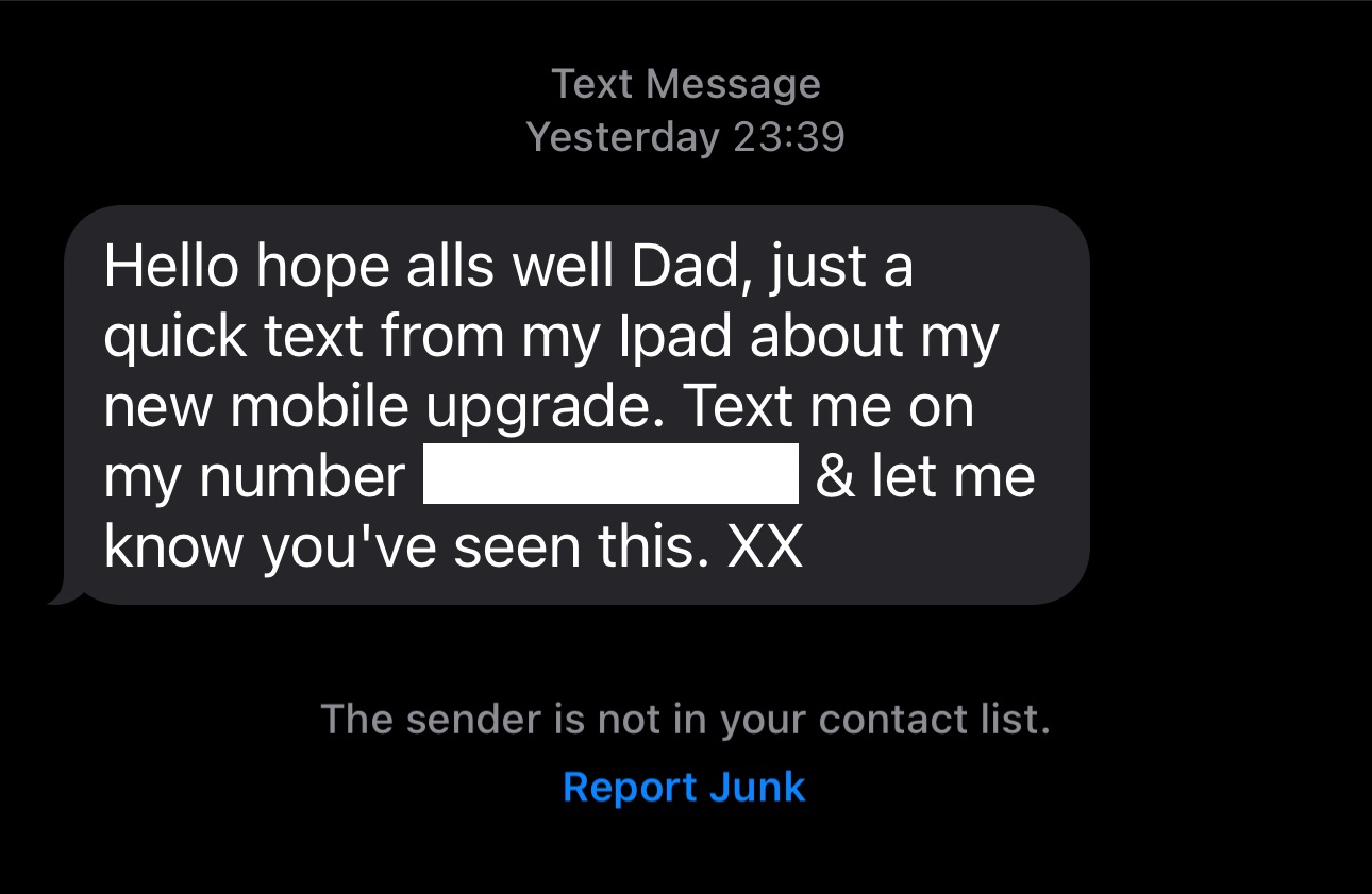 Imagine receiving a text message from what appears to be a family member, maybe your dad or your child. It reads, “Hello, hope all’s well Dad, just a quick text from my iPad about my new mobile upgrade. Text me on my number 07********* & let me know you’ve seen this. XX.” At first glance, it seems innocent, even friendly. But beware, it could be a trap.